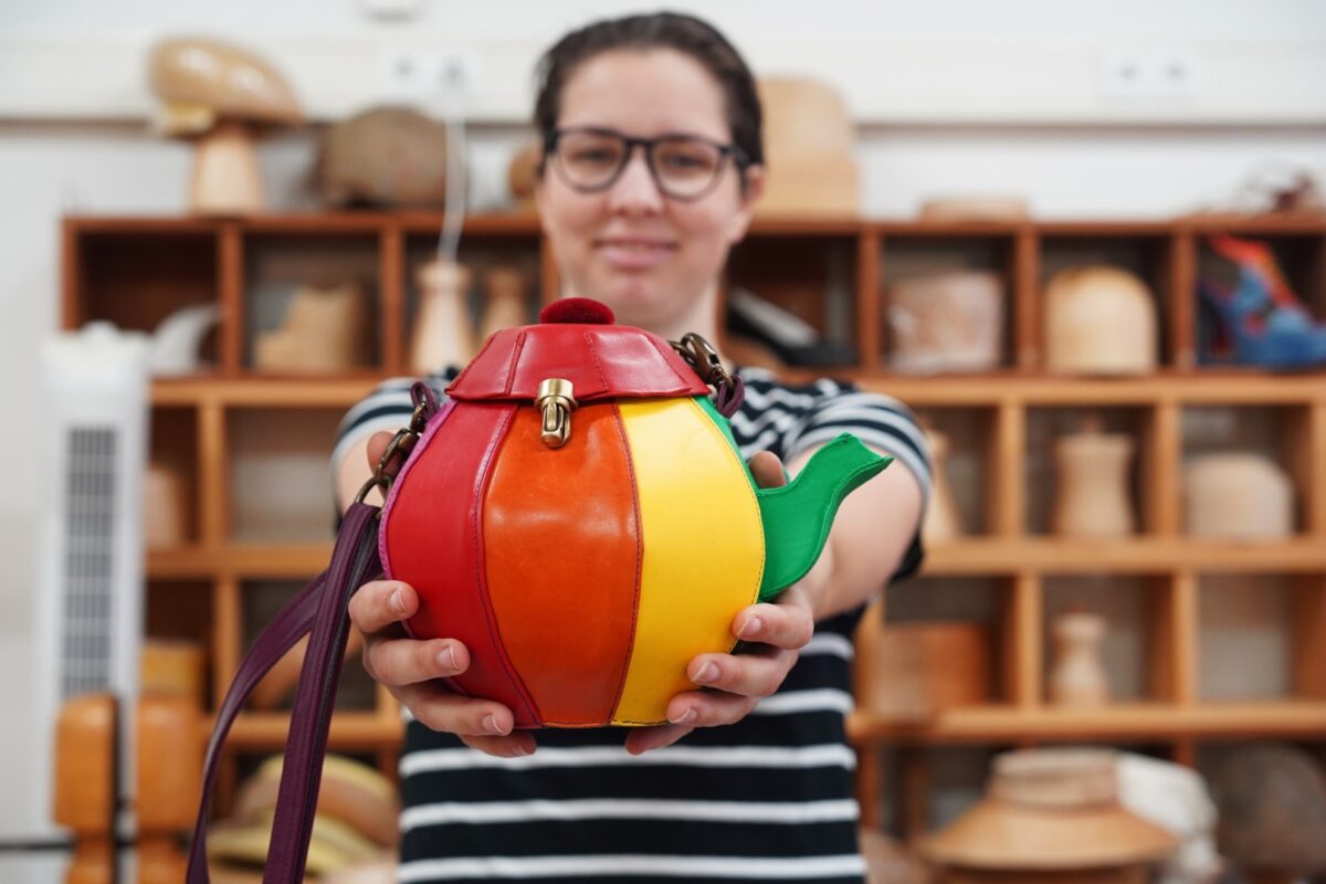 Student met eindwerkstuk: tas in de vorm van theepot
